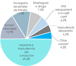 Por otro lado, de acuerdo al anuario estadístico de transporte 2018, la principal causa de siniestros fue la impericia e imprudencia del conductor, con un total de 12.660 siniestros, que representan el 49,6%; seguido de exceso de velocidad con 4.068 siniestros, con el 15,9% del total de siniestros de tránsito nacionales. Por embriaguez o droga el 7.5 %.
