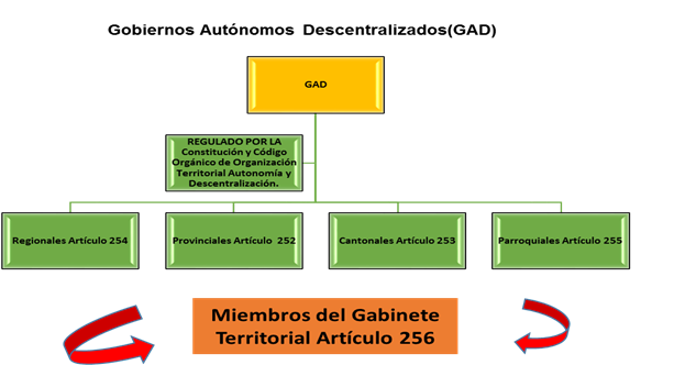 La Constitución de la República del Ecuador 2008 establece la conformación de los Gobiernos Autónomos Descentralizados como se especifica a continuación:
