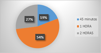 De acuerdo a los resultados de la información obtenida, el 27% de las víctimas de violencia presentan gravedad, por lo tanto, el tiempo de atención es de dos horas, seguido por 54% atención es de una hora, el restante 19% son atendidos en el tiempo prudencial dado por los indicadores de salud.