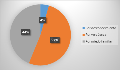 De la extrapolación de información se puede constatar que 52% no asiste por vergüenza, por miedo familiar 44% y el resto 4% por desconocimiento. Por tal motivo, se han creado reglamentos, normas y guías que ayuden a recuperar la valentía, integridad, dignidad y autoestima en personas, sobre todo mujeres y niñas, que han sido víctimas de agresión de género, para su pronta reintegración a la sociedad.