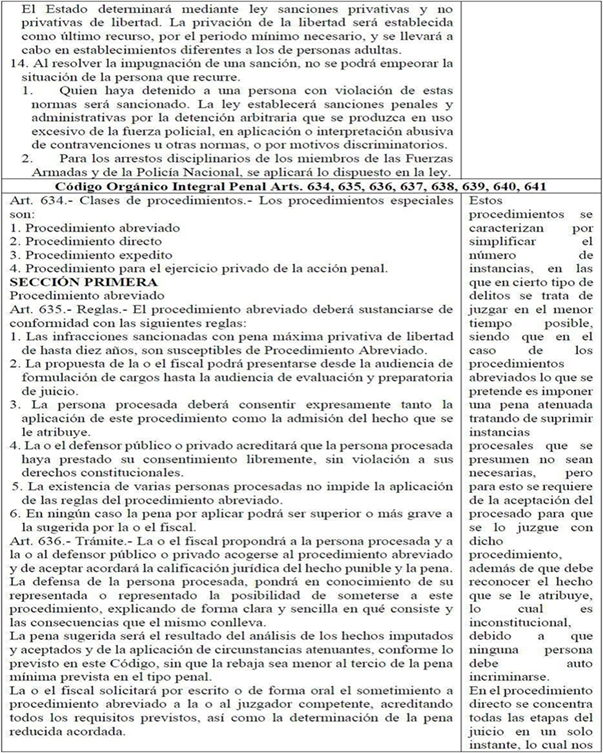 El procedimiento abreviado ha sido influenciado por legislaciones latinoamericanas, europeas, pero especialmente por la norteamericana, plea bargaining, pues, se han mantenido diferencias considerables. En este sentido, la contradicción; auto incriminación; recurrir o acceder a instancias; en judicial efectiva y en seguridad jurídica; los que son inherentes en procesos judiciales y procedimientos penales, ve coartada esta garantía constitucional que engloba los derechos descritos, porque impide disponer del plazo razonable y del ejercicio adecuado, lo cual no tiene cabida (Gutiérrez Campoverde et al., 2020). El criterio expresado líneas arriba se puede considerar como una postura que no necesariamente implique algún supuesto beneficio al imponer una pena en breve tiempo.