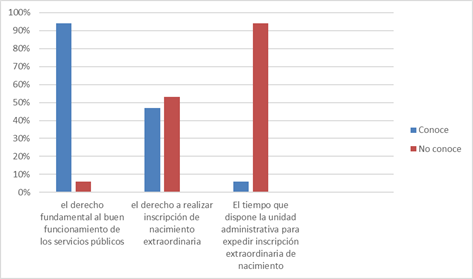 El 94% de los encuestados declaró conocer que la Constitución establece el derecho al buen funcionamiento de los servicios públicos. El 47% de los encuestados conoce su derecho a realizar inscripción extraordinaria de nacimiento; sin embargo, el 94% declara no conocer el tiempo que dispone la unidad administrativa para responder ante una solicitud de este tipo (Figura 1).