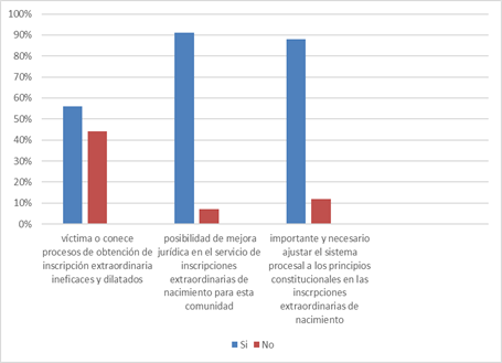 El 94% de los jefes de familia considera necesario y justo el establecimiento de regulaciones especiales para la prestación del servicio de inscripción de nacimiento a las comunidades aisladas donde no tienen acceso directo a un centro médico y tampoco a instituciones como el Registro Civil, y deben realizar dicha inscripción del recién nacido en lo posterior al proceso común para su registro. El 56% de los encuestado declara haber sido víctima o conocer casos de procesos dilatados e ineficaces en la obtención de inscripción extraordinaria de nacimiento y el 88% cree posible algún tipo de mejora jurídica en torno a lograr eficacia de este servicio para esta comunidad. El 91% considera importante y necesario ajustar el sistema procesal del desempeño administrativo del Registro Civil, como entidad pública, a los principios constitucionales, como medio para la realización y alcance de la eficacia jurídica y justicia eficaz, en el servicio de inscripción extraordinaria de nacimiento (Figura 2).