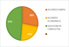El conocimiento sobre los medios alternativos de solución de conflictos, en cuanto a la conciliación es sumamente importante toda vez que se debe tener muy en cuenta como un derecho o una garantía que tenemos. Es así que el 30% de los encuestados dice que la conciliación es un simple acuerdo, el 25% por su parte piensa que la conciliación es únicamente un acuerdo económico, y tan solo un poco mas de la mirad, esto es, de 52% de los servidores públicos encuestados conoce de manera satisfactoria que la conciliación es un medio alternativo de solución de conflictos.