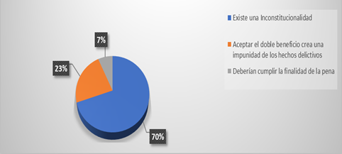 En la figura 3 se observa que el 70% coincide en que existe una inconstitucionalidad con respecto a la seguridad jurídica, la rehabilitación social y la libertad debido a que vemos a un estado castigador y No rehabilitador. El 23% de los encuestados acordaron en que aceptar el doble beneficio puede conllevar a dejar en impunidad los hechos delictivos, pues si bien se los sanciona, se acepta la responsabilidad, y esto sería burla al sistema judicial, al no cumplir con la pena. El 7% de los encuestados coinciden que las personas sentenciadas por un procedimiento abreviado ya reciben una pena por el delito sentenciado y que deberían cumplir con la finalidad de la misma.