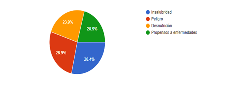Los encuestados reconocen que las personas en situación de movilidad, en este sector, viven en la insalubridad, propensos a enfermedades y al peligro y que, además, padecen desnutrición. Estos criterios indican que estas personas se encuentran en pésimas condiciones: en asentamientos informales, en campamentos improvisados, en hacinamiento, sin acceso a servicios básicos de saneamiento y agua potable; en resumen, en condiciones precarias y con falta de higiene, lo que aumenta los riesgos para su salud y su calidad de vida y también de la ciudadanía.