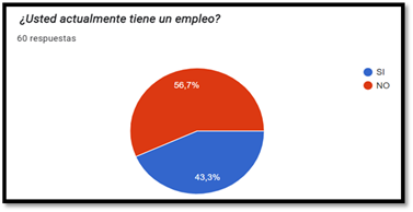 Se observa en la figura 1, se determina que veinte y seis jóvenes de los cuales representa el cuarenta y tres por ciento (43,3%) respondieron que, SI tienen actualmente un empleo mientras que treinta y cuatro jóvenes manifestaron que No, lo cual representa el cincuenta y seis por ciento (56,7%).