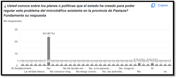 Se puede indicar según la figura 3, que el 100% de los jóvenes desconocen sobre los planes o políticas que el Estado ha creado para poder regular este problema del microtráfico que existe en la provincia de Pastaza, nos mencionan que no saben, no tienen conocimiento, desconocen sobre las políticas, etc.