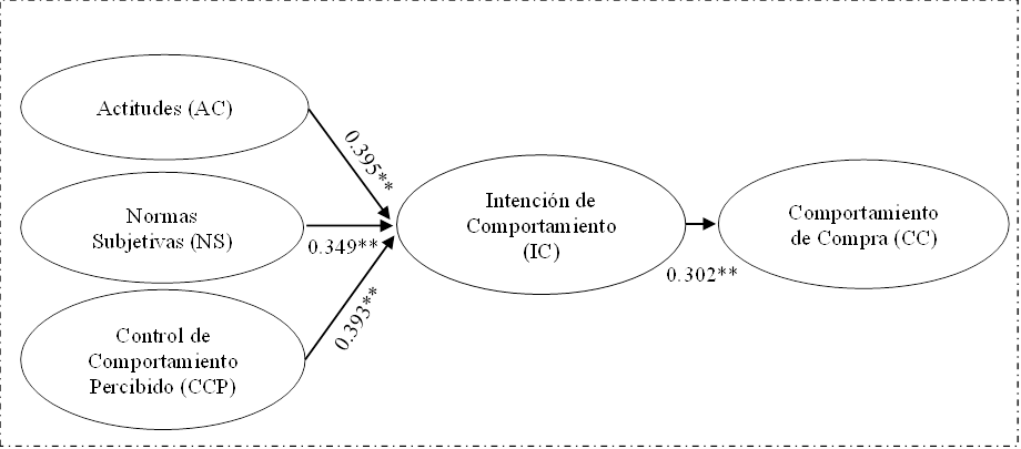 La examinación de las relaciones entre las variables del modelo permitió aceptar las cuatro hipótesis. A través de los estimados arrojados en el AMOS Output, se demostró que la Actitud (AC) (β=0,395**), y las Normas Subjetivas (NS) (β=0,349**) influyeron notablemente en la Intención de Compra (IC), mientras que el Control de Comportamiento Percibido (CCP) (β=0,393**) influenció moderadamente. Por otra parte, se evidenció que las Intenciones de Compra (IC) (β=0,3002**), influyen notablemente sobre el Comportamiento de Compra (CC). La Tabla 4 refleja los resultados finales del estudio.