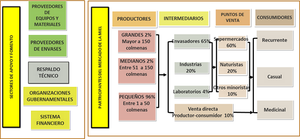 La demanda potencial de miel se calcula en 700 toneladas, que para ser satisfecha tendría que ser servida por cinco veces el número actual de colmenas (Beltrán Ayala & Vásconez Robalino, 2020). La mayor parte de la miel producida es demandada por consumidores industriales que procesan elaborados a base de miel de abejas o la envasan para comercializarla con sus propias marcas.