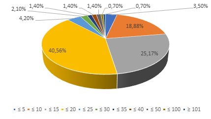 Los apicultores de Manabí están distribuidos preferentemente en las regiones que tienen precipitaciones pluviales de corto período y los valles donde se conserva niveles de humedad que ayudan a sostener la presencia de malezas con floración cíclica y avance escalonado. Algunos criadores de abejas realizan sus labores en áreas secas, con menor nivel de lluvias, con menor número de cosechas al año. De las colmenas registradas, el 62% están instaladas en la jurisdicción de Jipijapa, el 17% en Rocafuerte, 16% en Portoviejo y el 5% en San Vicente. De esa distribución por cantón, el 40,56% de los emprendimientos tiene 20 colmenas, el 25,17% posee hasta 15 colmenas, el 19% tiene hasta 10 colmenas, como se muestra en la Figura 1.