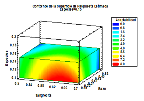 En la figura de superficie de respuesta (figura 2), se evidencia que las concentraciones de los componentes de la mezcla que se pueden utilizar para elaborar un producto de buena aceptabilidad son: sangrecita de 0,58 a 0,70 Kg, bazo de bovino 0,30Kg y especies de 0,15 Kg
