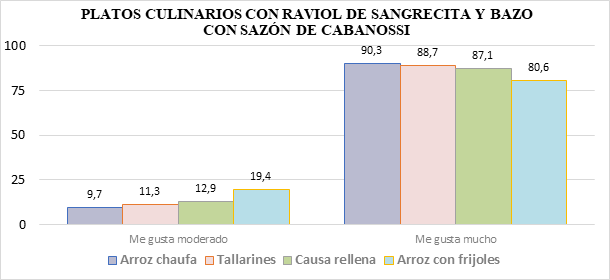 Figura 4. Aceptabilidad de platos culinarios con raviol de sangrecita y bazo de bovino con sazón de cabanossi.