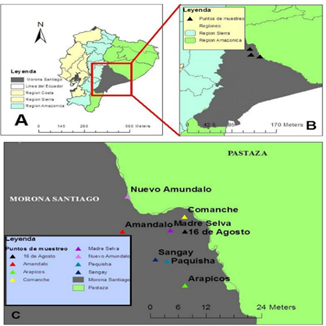 Figura 1. Mapas de: Ecuador, Morona Santiago y Ubicación de las fincas.