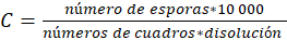 Donde: C: concentración; Número de esporas: Suma de todas las células contadas en todos los cuadros; Número de cuadros: Cuadros de Cámara de Neubauer; Disolución: Para una dilución de 1: 10. Dilución = 0,1.
