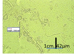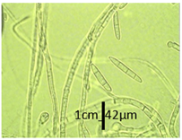 Los conidios fueron fácilmente separables y con paredes gruesas, de forma oval, elíptica, con un largo de 43,52 µm. Los aislados cumplieron los postulados de Koch, lo que evidenció su identidad.