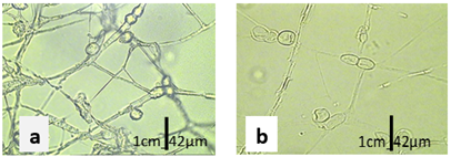 Durante el aislamiento de Fusarium spp. se identificó el género de hongos anamorfos asociado a raíces enfermas con síntomas de marchitez vascular, correspondiente al género: Aspergillus niger (P.E.L.van Tieghem) procedentes del cantón Palora. De este hongo fue posible observar esporas e hifas septadas, no se determinaron las dimensiones de las estructuras (Figura 5 a y b).