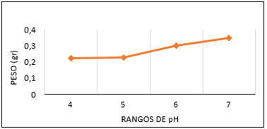 Se observó el crecimiento micelial del aislado UEA-Fsp4 en todos los valores de pH evaluados (desde 4,0–7,0), siendo el pH 7 que produjo mayor peso del micelio obtenido valores de 0,34 g, seguido del pH 6 con un valor de 0,30 g y el pH 4 y 5 con valores similares entre sí de 0,2 g. (Figura 9).