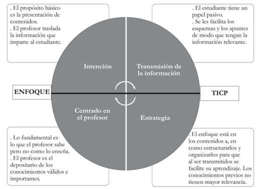 Por lo tanto, el tema que se plantea sobre aprendizaje y motivación, encierra diversas aristas para desentrañar el fondo de la educación, la cual se basa primordialmente en seguir reproduciendo el modelo cognitivo, a pesar de las propuestas pedagógicas centradas en el estudiante como centro del proceso y no el docente (Burgos-Briones, et al., 2019), es así que (Gargallo-López, et al., 2017), comentan que este enfoque está empleándose con mayor frecuencia en la educación superior, considerada efectiva por parte de los estudiantes a partir del aprendizaje cooperativo – colaborativo que realizan. Lo cual devela la diferencia entre el enfoque centrado en el docente y en centrado en el estudiante, a continuación, en la figura 1 y 2, se evidencian: