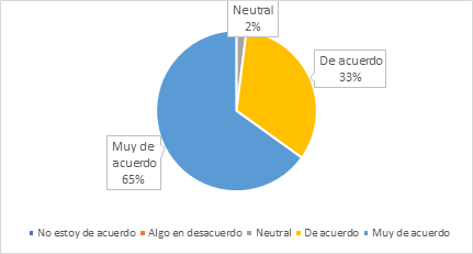 En la Figura 1 se presentan los resultados del nivel de acuerdo con el que se encuentran los docentes con respecto a recibir capacitación que vincule a la tecnología con la pedagogía. En efecto, el 65% se encuentra muy de acuerdo en recibir este tipo de capacitación y el 33% señala estar de acuerdo. Únicamente el 2% manifestó una opinión neutral.