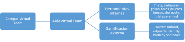 Frente a los problemas expuestos, se plantea una propuesta que procura articular las herramientas internas de la plataforma Teams con las externas. De tal suerte que, las internas permitan cumplir con las expectativas de una clase activa, pero cuando son insuficientes, se pueda recurrir a gamificación externa que es libre, sin embargo, este proceso debe procurar evitar las distracciones de la publicidad. Las herramientas que se plantean en la Figura 1 muestran justamente aquellos soportes que están al servicio de los docentes de forma interna al aula virtual. Sin embargo, también hace notar otras herramientas que no están dentro de la plataforma y que pueden emplearse para ayudar al docente a mejorar las experiencias educativas.