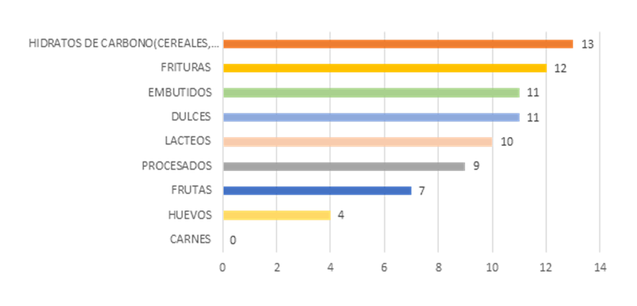 El consumo más alto es de hidratos de carbono 13%, seguido de frituras 12%, embutidos 11%, dulces 11%, lácteos 10% y procesados 9%; solamente un 7% de frutas, 4% de huevos y 0% de carnes. A partir de estos resultados, se evidencia que los estudiantes no están consumiendo lo nutricional óptimo para su desarrollo integral.