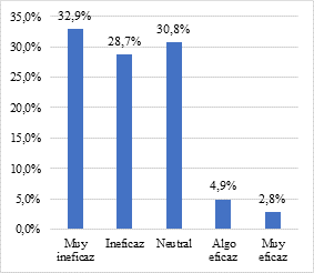 Al evaluar específicamente los dos principales aspectos positivos de la práctica virtual, se determinó que los retos principales eran el desarrollo de las clases prácticas y el incremento de habilidades clínicas. Se registró que el 61.6% de estudiantes consideraban que las habilidades clínicas adquiridas mediante esta modalidad virtual eran muy ineficaces, mientras que el 62% consideró que las prácticas en general fueron ineficaces. Ver figura 2.