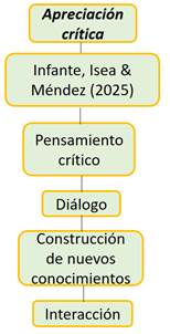 En la figura 5, Infante et al. (2025) expresan que el pensamiento crítico es fomentado por medio del diálogo, lo cual conduce a la construcción de nuevos conocimientos mediante la interacción. Este aspecto ha sido relevante en este estudio, debido a que, por medio de la iconografía, el tejido Matsigenka y el lenguaje visual, se han podido constatar aprendizajes que unen culturas y propician encuentros enriquecedores del conocimiento.