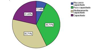 No solo es importante un equipo o docente de apoyo y la disponibilidad de recursos para poder trabajar con estudiantes de NEE sino también estar capacitado para dictar la cátedra de un área un poco compleja en diversidades presentes, reflejado en el 78,6% de docentes que manifiestan estar medianamente, poco y muy poco capacitados. Revisar figura 5.