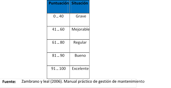 Ubicación de la puntuación global de una empresa de acuerdo a la situación del mantenimiento.