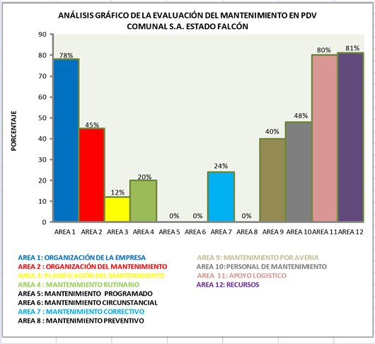 Área No 11. Apoyo Logístico: De acuerdo con la evaluación del sistema de gestión de mantenimiento realizado en la empresa PDV Comunal S.A, obtuvo un ochenta por ciento (80%) ya que en su mayoría cumplió con casi todos los principios básicos, sin embargo, la organización del mantenimiento no tiene el nivel jerárquico adecuado dentro de la organización en general y la gerencia no delega autoridad en la toma de decisiones.