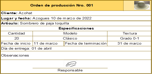 Orden de producción: tan pronto se concrete un pedido con un cliente, la tejedora emite la orden de producción con las siguientes características: (ver figura 3).