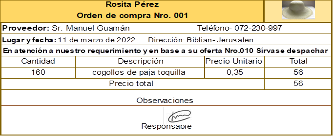 Orden de compra: la artesana considera necesario realizar la compra respectiva para proveerse de materia prima con el fin de cumplir con la orden de producción, una vez llegado a un acuerdo con el proveedor se emite el siguiente documento: (ver figura 4).