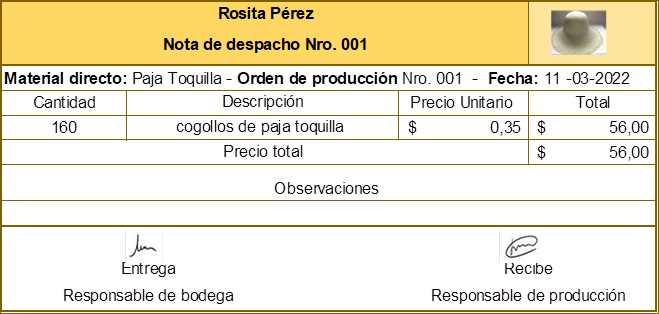 Nota de despacho: comprobada la materia prima, se despacha la misma para la elaboración del producto (ver figura 6). Se registra en la hoja de costo (ver figura 11).