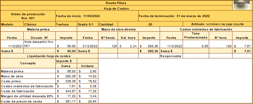 Asimismo, se establece la hoja de costos como complemento del inventario de productos en proceso, en esta es posible determinar costos que se diferencian de la calidad, diseño y detalle requerido; en este documento se categorizan los tres elementos de costo (materiales, mano de obra y CIF), se emite cuando el producto es solicitado por el cliente y se utiliza durante todo el proceso productivo, permite sumar costos por factores y una vez acumulados todos los elementos se obtiene el costo total de producción necesario para elaborar el pedido (Valle-Toaquiza et al. 2020).