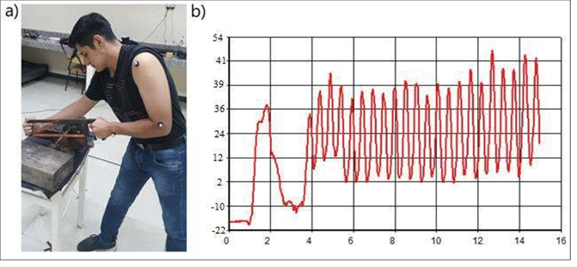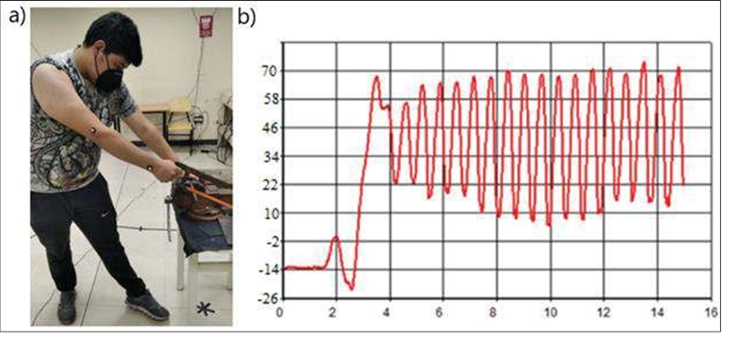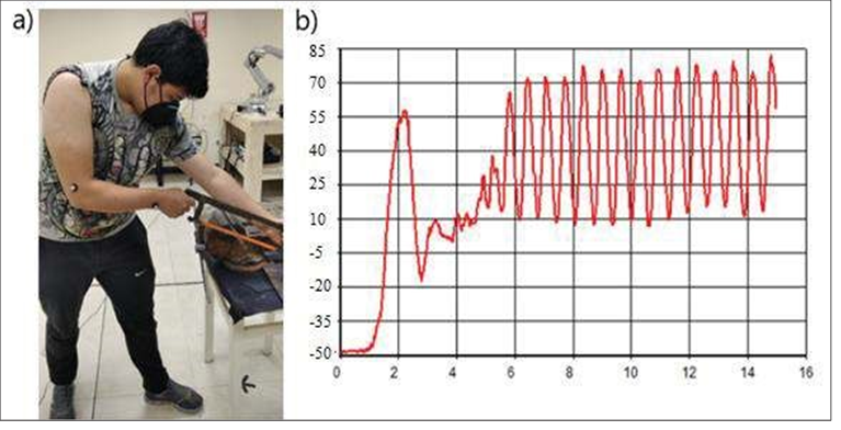 En este entorno experimental se simuló la manera incorrecta del uso de la sierra, cuando se realiza la acción con un solo brazo, como se observa en la figura 10 a). En la figura 10 b), el posicionamiento inicial toma un lapso de 4 segundos, después de esto se empieza a realizar la acción con la sierra a una mano en donde se encontró un rango de flexión máxima de 51,56° y una extensión máxima de -5,65°, estos rangos serán referenciales del uso inadecuado de la sierra.