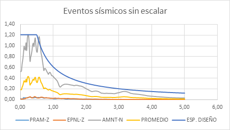 A continuación, ya con los disipadores de energía diseñados se implementará un análisis dinámico no lineal (ADNL) en un software especializado para determinar el nuevo desempeño de la estructura. Para realizar el escalamiento de los eventos sísmicos se escogió tres registros sísmicos que se adaptaban al espectro de diseño (ver figura 4), en base a eso se realizó el primer escalamiento en función del periodo fundamental de vibración de la estructura (ver figura 5).