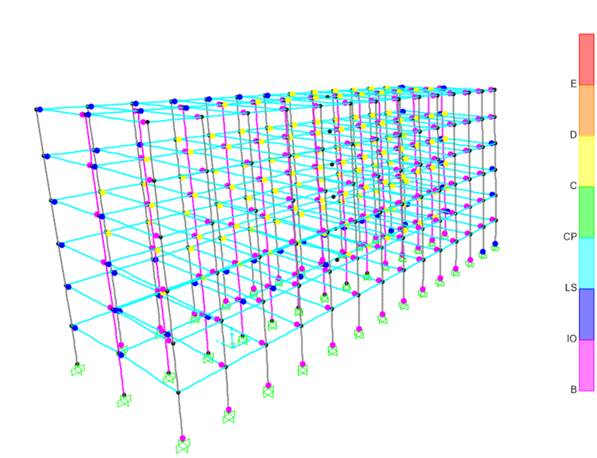 A continuación, se muestra la edificación deformada 14,3 cm (paso 3 de la modelación) donde se puede evidenciar la generación de rótulas plásticas, comprobando lo mencionado anteriormente.