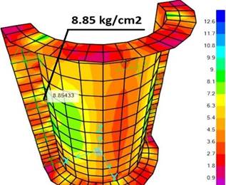 El esfuerzo máximo, también conocida como esfuerzo de Von Mises, se determina mediante cálculos matemáticos que tienen en cuenta diversos factores, como las fuerzas de cizalladura y tracción. Para el cuerpo del encofrado (ver Figura 7), el esfuerzo máximo experimentada en el panel del cuerpo del encofrado es de 9,08 kg/cm2. Cumple.
