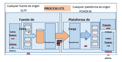 En la figura 1 se explica el proceso ETL aplicado a nuestro trabajo de investigación donde las entradas son todos los archivos en Excel (xls), Word (doc), BDD (db), SQL (sql) y cualquier archivo sea o no de tipo plano (Bitácoras, reportes, matrices usadas en el área de video vigilancia del Ecu 911 Tulcán) se extraen para su respectiva codificación de datos. Continúa con la trasformación y transporte de los mismos de un sistema a otro, modificándolos en su proceso para que finalmente sean tratados y cargados correctamente tras alojarse en su nuevo destino (Informes dinámicos, planos estadísticos, entre otros) por medio de la plataforma Power BI. Según la publicación en el foro online “Extracción, fase clave en los procesos ETL (2013).