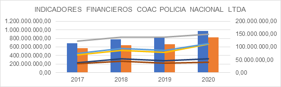 Consiguiente la COAC Policía Nacional Ltda., refleja la fluctuación de los siguientes indicadores en estudio donde el activo crece durante los cuatro periodos en 41,4 p.p., llegando $974.459.302,71 dólares, mientras que, su pasivo incrementa en 45,64 p.p., obteniendo $824.958.971,55 dólares, de igual manera, el patrimonio crece en 21,38 p.p., llenado a $149.500.331,16 dólares considerando que su pasivo es el que más creció en la cooperativa de igual manera el margen bruto financiero se extendió a 39,92 p.p., mientras que el margen neto financiero crece en 18,55 p.p. Esto indica que es la cooperativa mantiene un nivel de crecimiento bajo la razón razonable en la situación financiera y las contribuciones registradas en las normas Estatales.