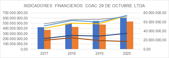 Consiguiente de los indicadores financieros de la COAC 29 de octubre Ltda., se e enfoca en los activos donde mantiene un crecimiento 41,64 p.p., llegando a $605.296.285,74 dólares en los cuatro últimos periodos, además sus pasivos incrementan en 44,04 p.p., generándose $534.351.706,23 dólares y el patrimonio crece en 25,86 p.p. obteniendo $ 70.944.579,51 dólares, así también los gatos crecen en 60,47 p.p. mientras que los ingreso en 45,41 p.p., legando $ 75 millones de dólares que supera al patrimonio, mientras que el margen bruto financiero crece en 46,54 p.p., y por último el margen neto financiero decrece en 14,55 p.p., donde se interpreta que el análisis contable y los estados financieros de la cooperativa se rige a las normas vigentes estipuladas en los entes reguladores del Estado.