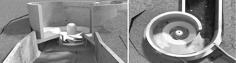 El flujo de agua se dirige a través de un camino de concreto optimizado que conduce el agua como un vórtice (Figura 3), lo que proporciona la energía necesaria para hacer girar las aspas de un generador. Después de pasar por la turbina, el agua regresa al río o canal. La energía producida puede ser conectada directamente al consumidor o a la red de distribución nacional simultáneamente (EcoInventos, 2022).