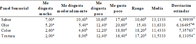 La percepción del sabor varía en un rango de 13.1333, con una media de 10.60 ± 4.39939, la desviación estándar moderadamente alta sugiere cierta variabilidad en las respuestas del panel respecto al sabor, en cuanto a la percepción del olor varía en un rango de 11.6333, con una media de 15.40 ± 6.16495, donde la desviación estándar relativamente alta indica cierta variabilidad en las respuestas del panel respecto al olor, mientras que la percepción del color varía en un rango de 11.4333, con una media de 18.20 ± 7.35763, presentando una desviación estándar alta sugiere variabilidad en las respuestas del panel respecto al color, por último, la percepción de la textura varía en un rango de 11.5333, con una media de 16.40 ± 6.11054. La desviación estándar relativamente alta indica cierta variabilidad en las respuestas del panel respecto a la textura (tabla 4).