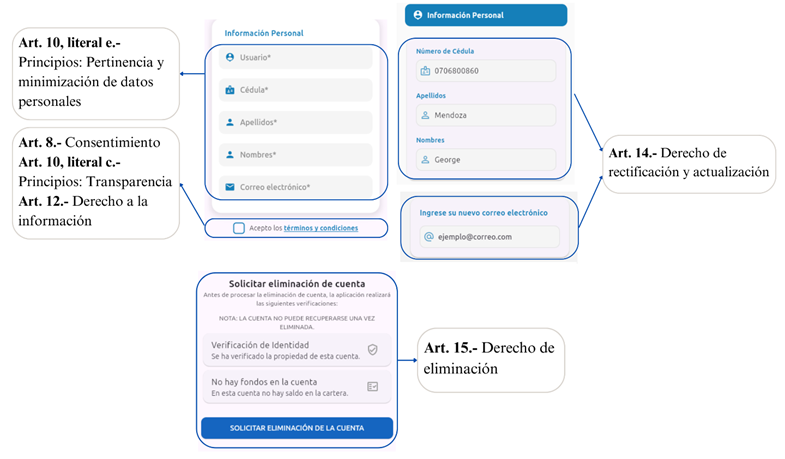 La Figura 2 muestra las pantallas clave de la aplicación relacionadas con el registro, actualización y eliminación de datos personales. En la interfaz de registro se informa claramente sobre los datos solicitados y se incluye un enlace directo a los términos y condiciones, en línea con lo dispuesto en el artículo 10, literal e) y el artículo 8 de la LOPDP. Las pantallas de edición y actualización de datos personales, como nombres o correo electrónico, se alinean con el ejercicio del derecho de rectificación (art. 14), mientras que la opción de eliminación de cuenta responde al derecho de supresión establecido en el artículo 15 de la misma ley.