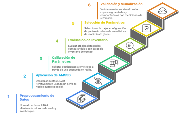 La metodología propuesta operacionaliza el algoritmo de desplazamiento medio adaptativo tridimensional (AMS3D) con modelo de forma de copa para la segmentación de copas individuales de árboles (ITC, por sus siglas en inglés). El diseño integra el preprocesamiento de datos LiDAR, la estimación adaptativa del perfil del núcleo, la calibración de parámetros basada en relaciones alométricas y la evaluación cuantitativa frente a inventarios de referencia. Este flujo de trabajo se fundamenta en los avances recientes en segmentación mediante desplazamiento medio adaptativo (Hu et al., 2017; Yan et al., 2020; Lei et al., 2022) y en modelos sensibles a la forma de la copa (Xiao et al., 2016; Tusa et al., 2021). La Figura 1 resume el flujo metodológico de la presente investigación y se describe a continuación.