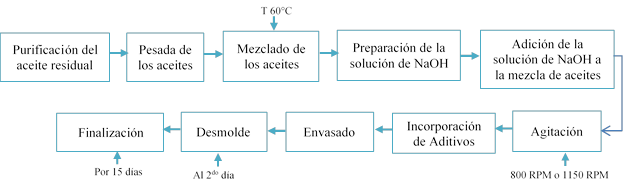 En la Figura 1 se presenta el procedimiento aplicado, se consideraron aspectos importantes que mejoran la reacción de saponificación, como lo fue un 8% de sobre-engrasado a fin de reducir al mínimo la cantidad de hidróxido de sodio que no reaccionará [1] y el aumento de la temperatura de la mezcla de aceites [12].