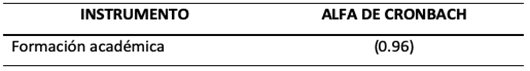 En la tabla 3 instrumento II (Formación académica) encontramos los resultados respecto a la prueba de confiabilidad; el coeficiente de Alfa de Cronbach (α) es de 0,96 considerando al instrumento de poseer una fiabilidad adecuada.