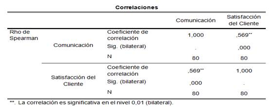 Según la tabla 16 La hipótesis alterna plantea que la Comunicación se relaciona significativamente con la satisfacción del cliente en la empresa Ozonomedica – La Molina, 2021, en los resultados estadísticos se puede apreciar que el coeficiente de correlación arroja un valor considerado moderado (rs=0,569), por lo tanto, se acepta la hipótesis especifica 3.