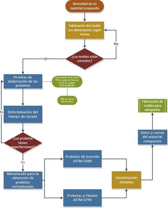 El producto obtenido sin defectos se utiliza en la elaboración de las probetas para los dos ensayos descritos tanto para el material compuesto como el matriz, cortando con sierra metálica las mismas basado en las normas ASTM D3039-14 y ASTM D7264-15 para el compuesto, y ASTM D638-14 y ASTM D790-15-e2 para la matriz.